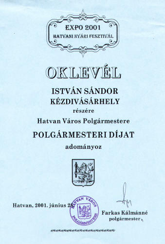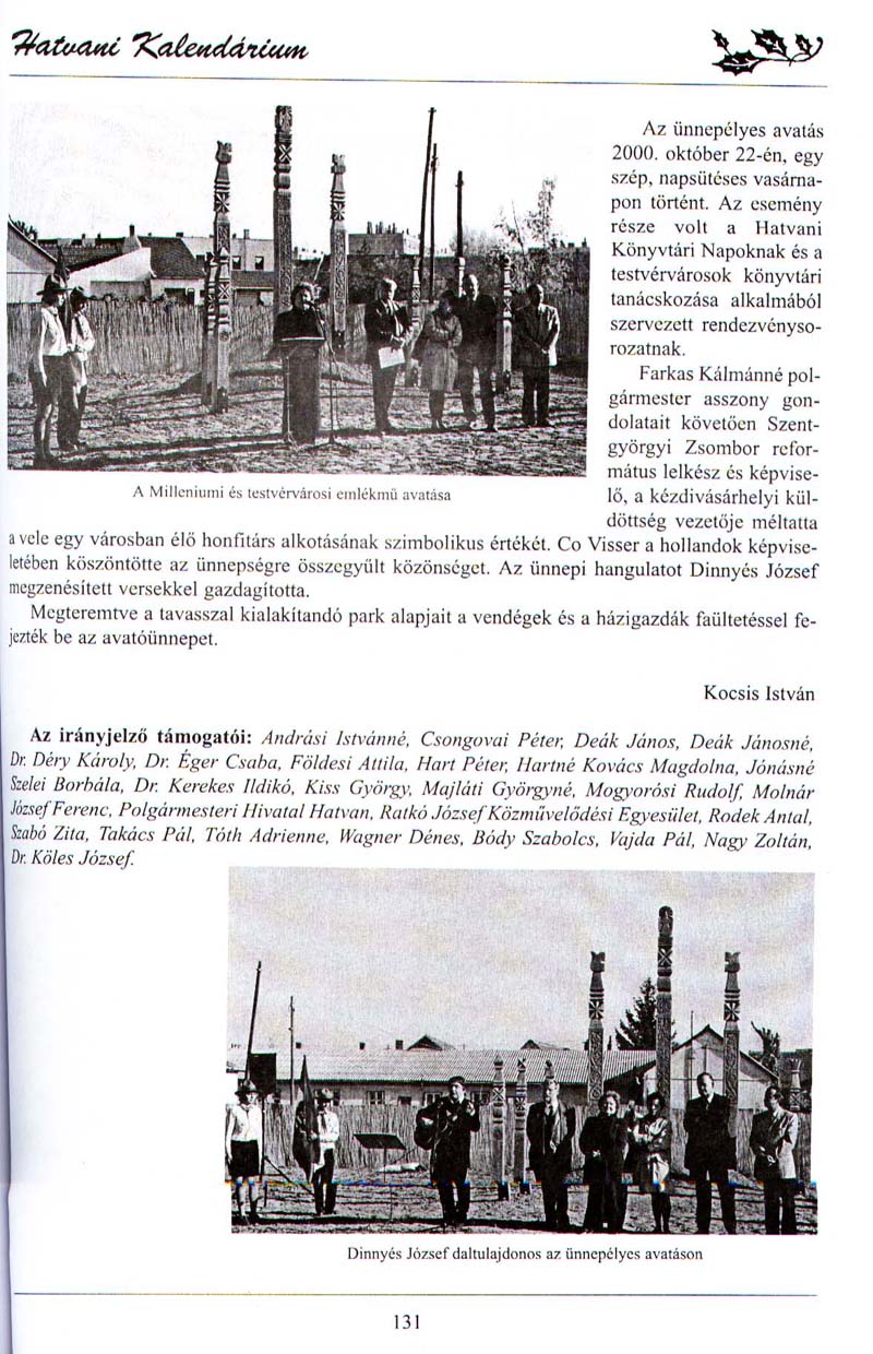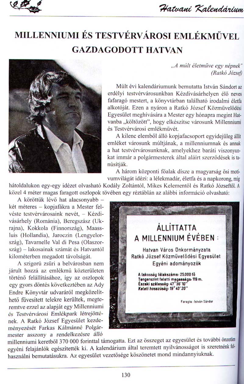 - Millenniumi és testvérvárosi emlékművel gazdagodott Hatvan. Hatvani Kalendárium, 2001/ 1, 2