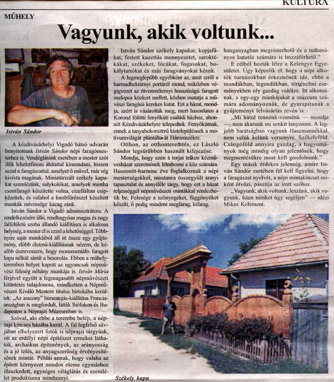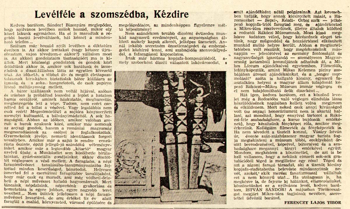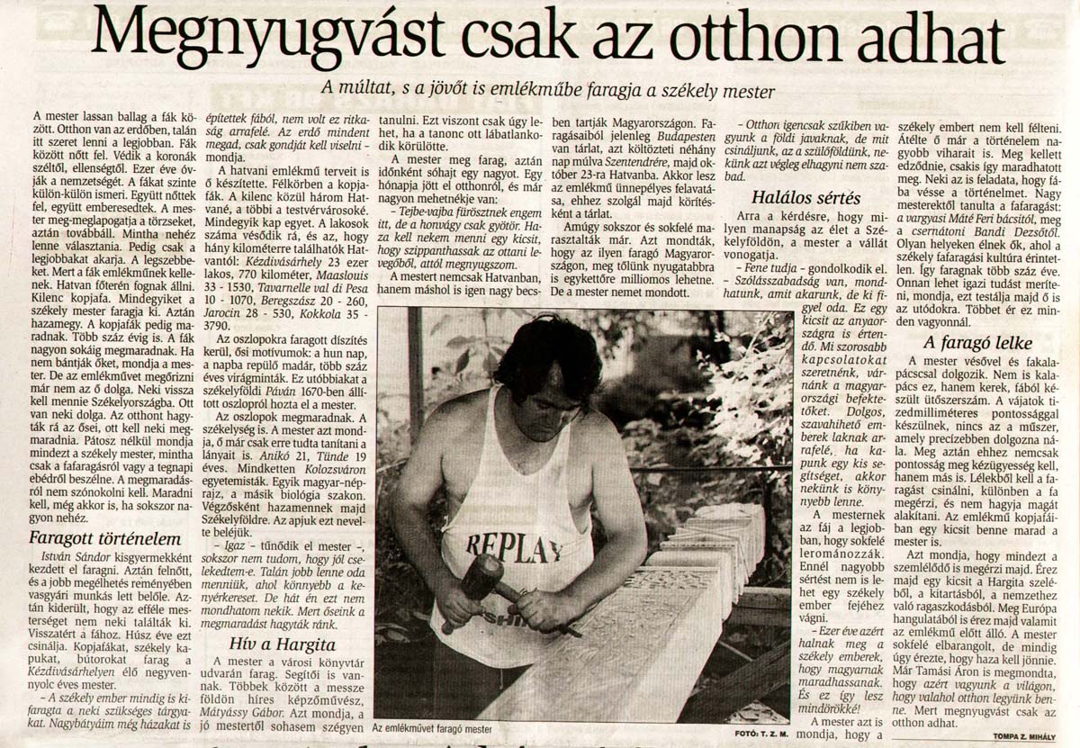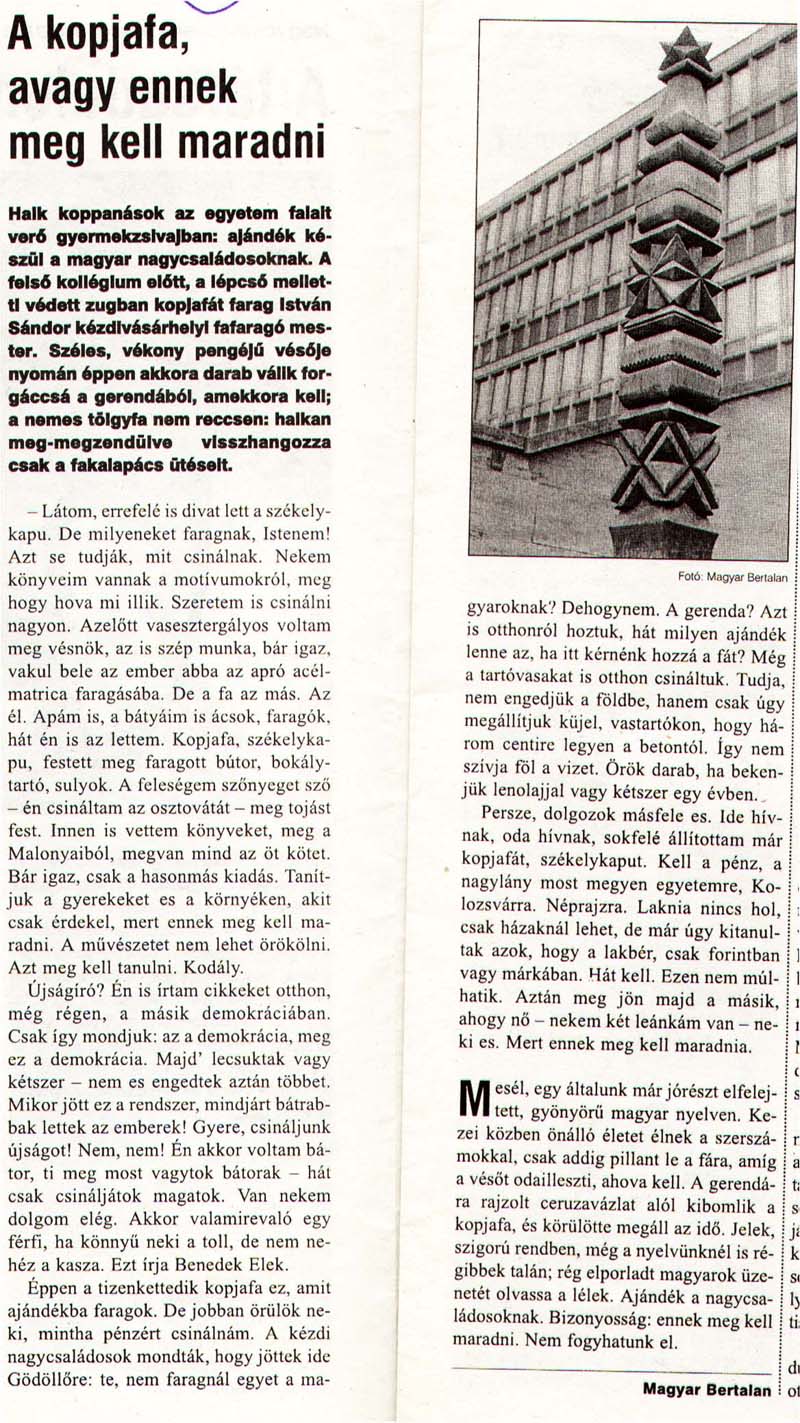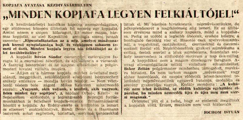 - "Minden kopjafa legyen felkiáltójel!". Háromszék, 1990.