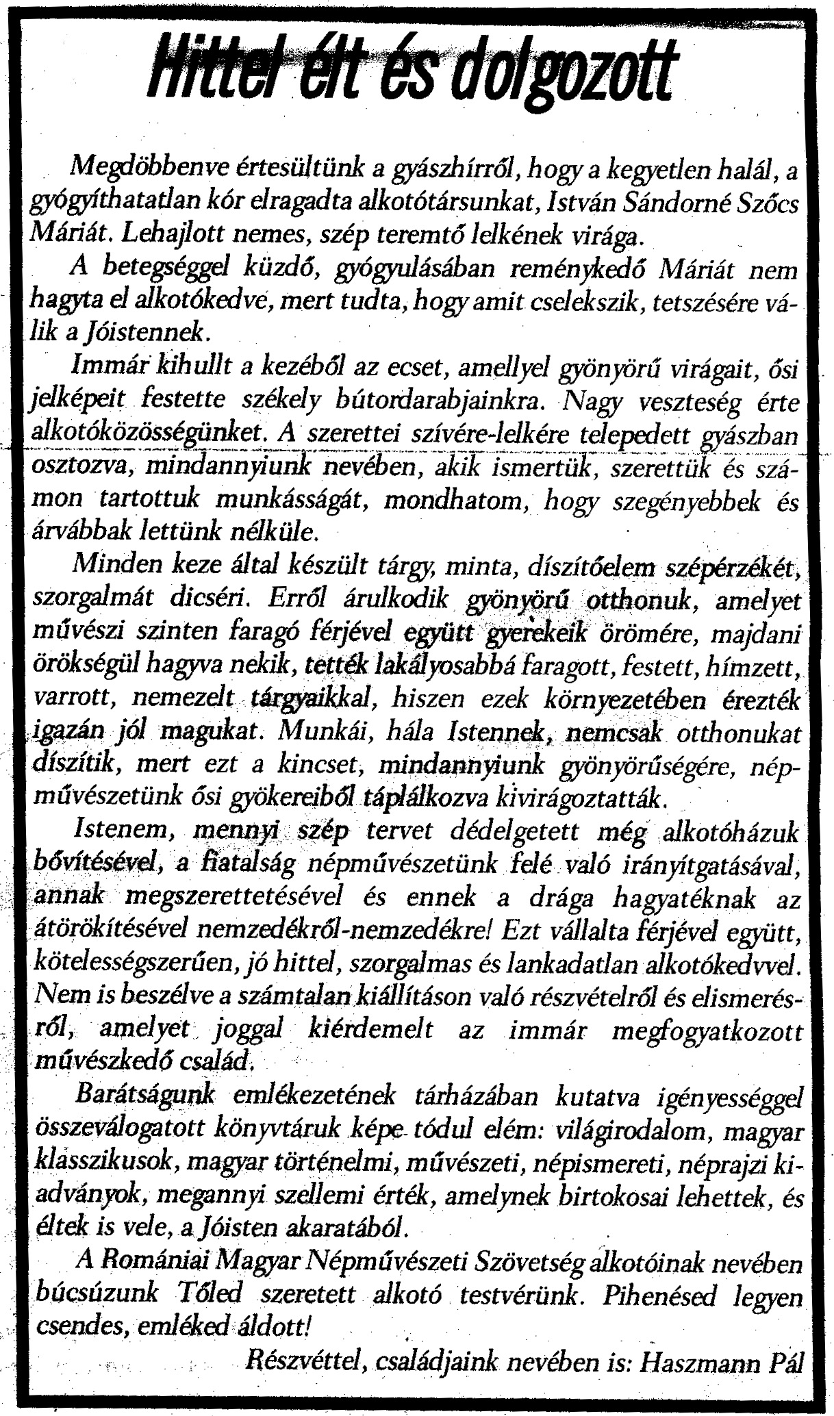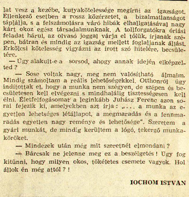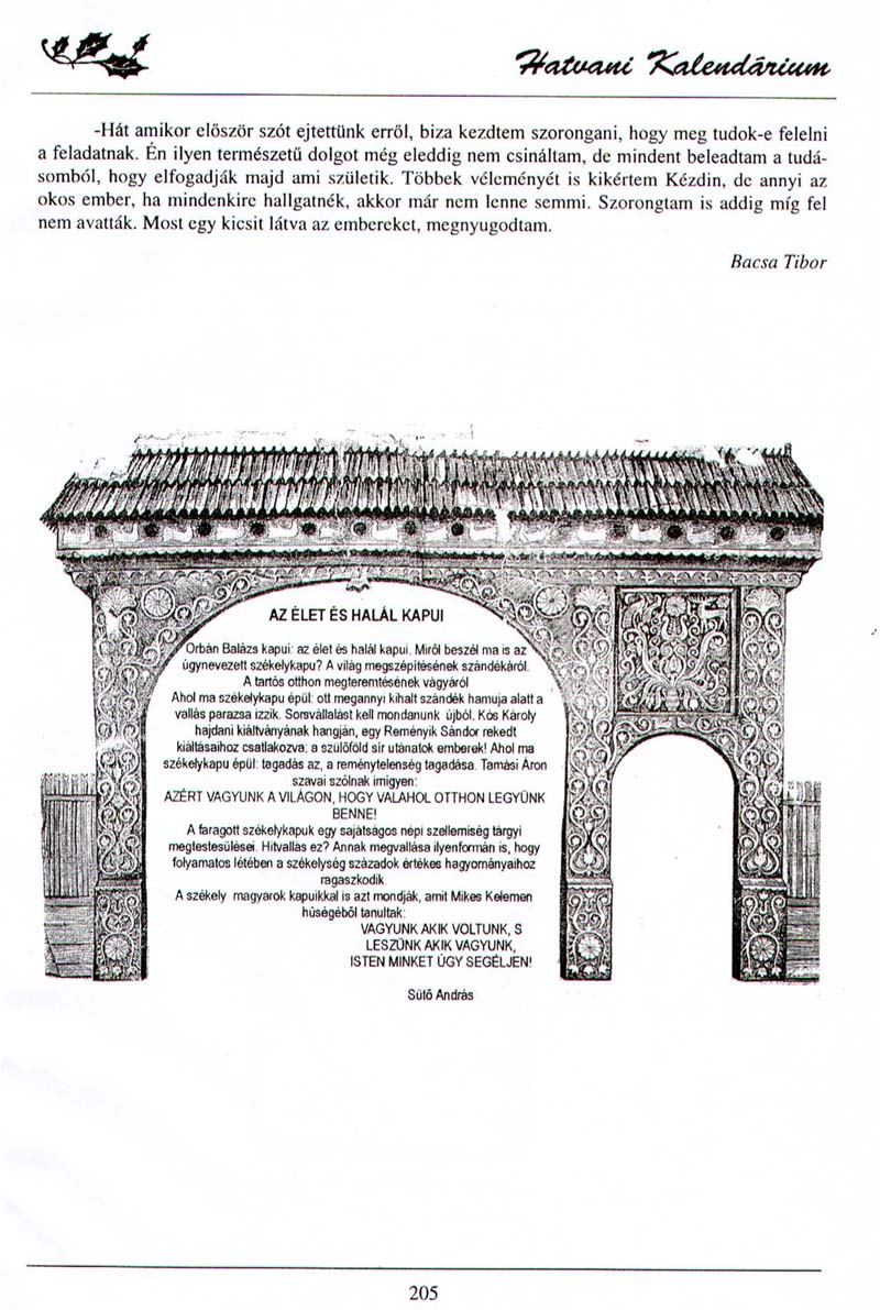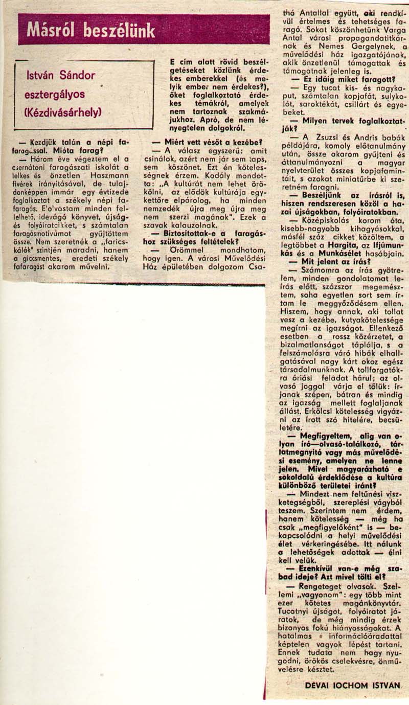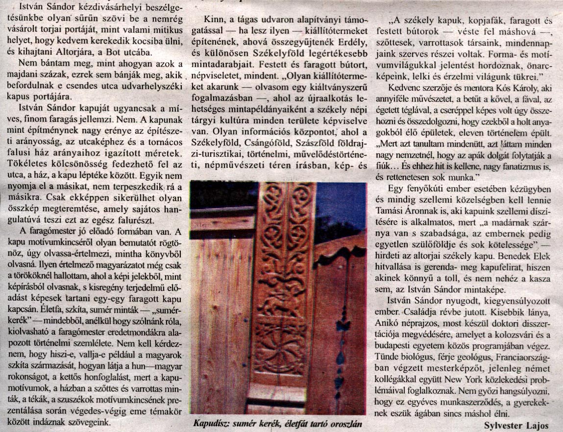 - "Minden kopjafa legyen felkiáltójel!". Háromszék, 1990.