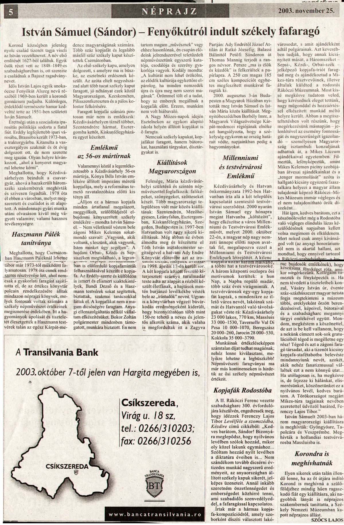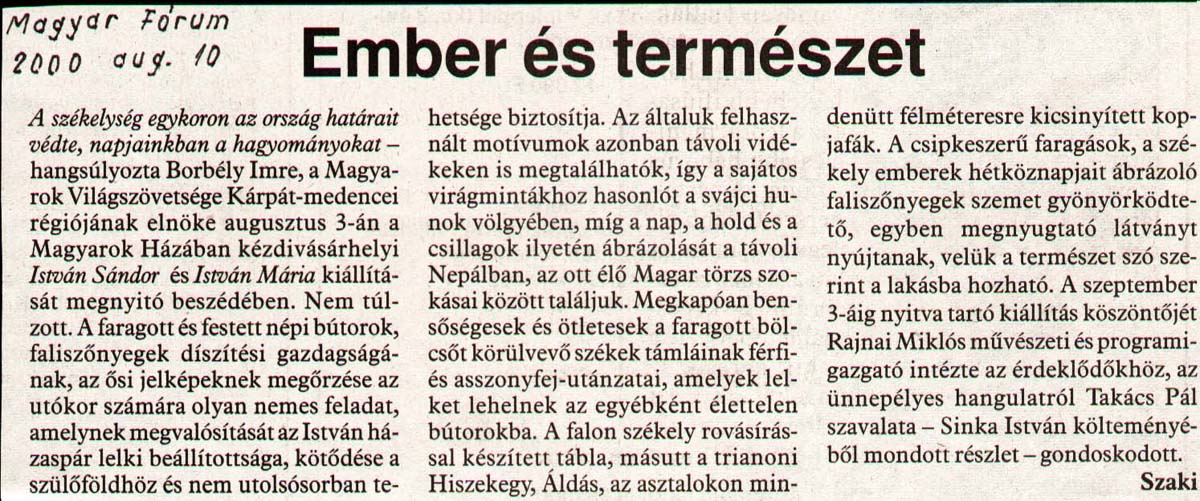 - István Sámuel (Sándor) - Fenyőkútról indult székely fafaragó. Hargita Népe, 2003.