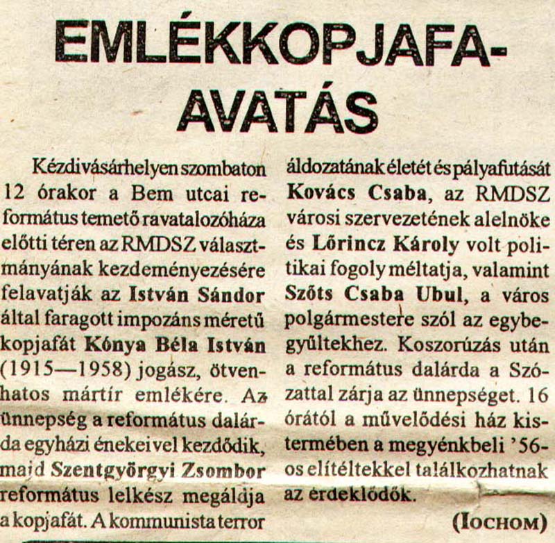 - Emlékkopjafa-avatás. Háromszék, 1994.