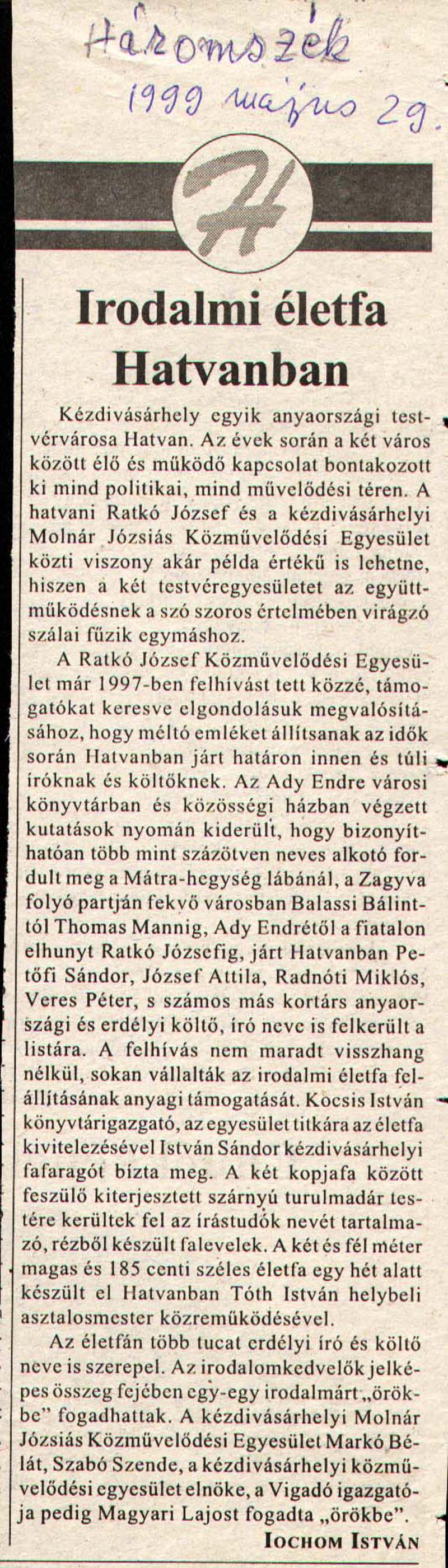 - Irodalmi életfa Hatvanban. Háromszék, 1999.