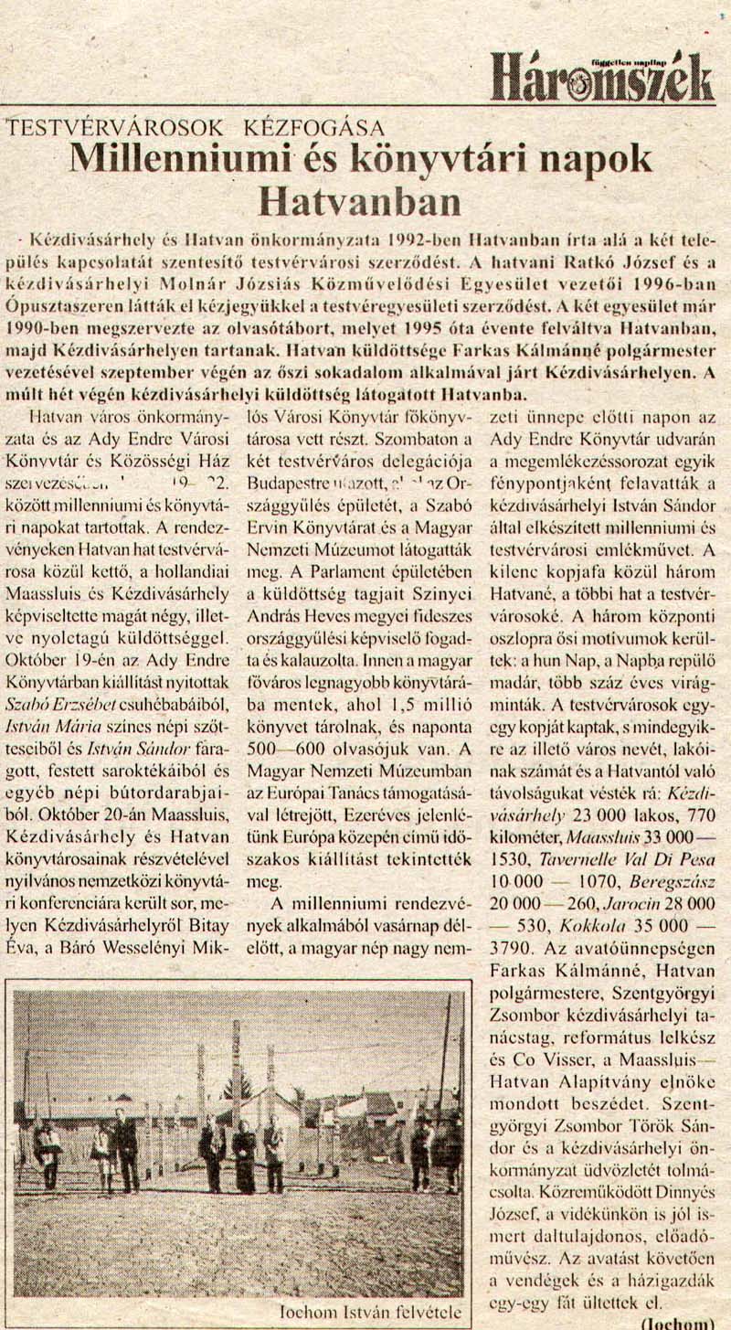 - Millenniumi és könyvtári napok Hatvanban. Háromszék, 2000.