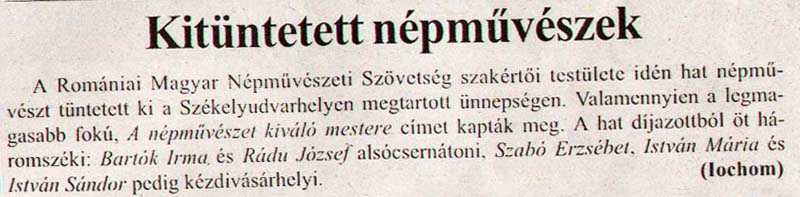- Kitűntetett népművészek. Háromszék, 2003.