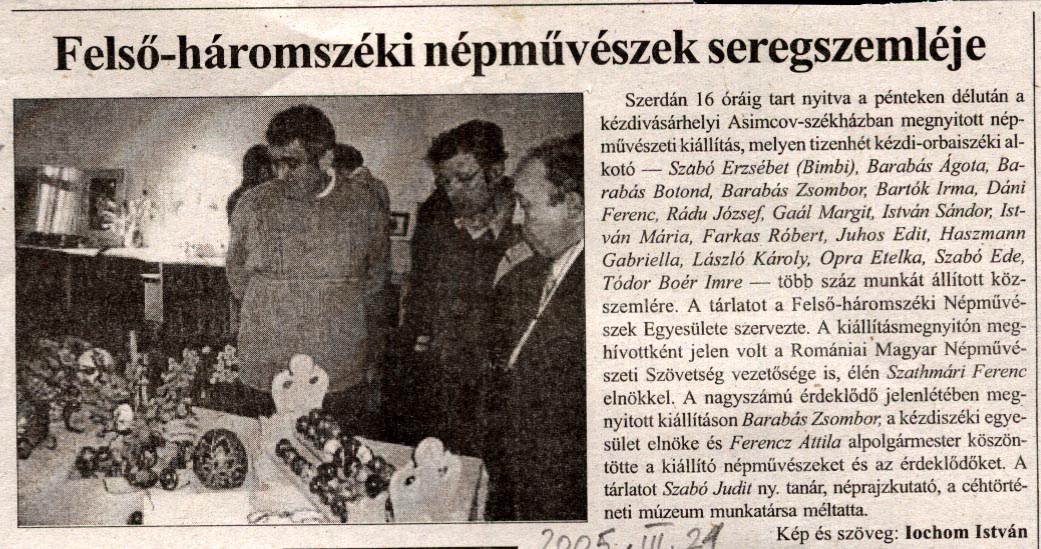- Felső-háromszéki népművészek seregszemléje. Háromszék, 2005.