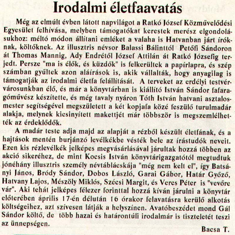 - Irodalmi életfa Hatvanban. Heves Megyei Hírlap, 1998.