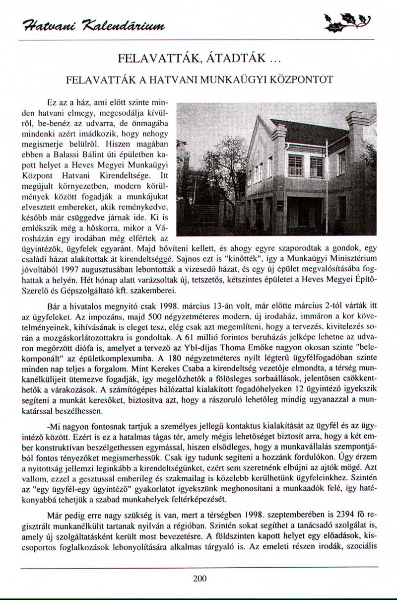 - Felavatták, átadták... Hatvani Kalendárium, 1999/ 1, 2, 3, 4, 5, 6